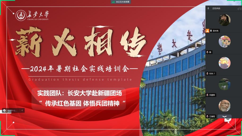 7月14日晚七点实践队在员工领队袁林桃的组织下开展了线上培训会,针对文稿撰写、外联等适宜进行分工,并对行程进行了详细的安排。为了增强培训的针对性和时效性,培训会还特别邀请了往年优秀实践团队代表丁光盛学长进行经验分享。他结合自身的时间经历,从分配、调研到成果展示等方面进行了详细的讲解,分享了宝贵的经验和教训,并对实践队遇到的问题和困惑进行了一一解答。