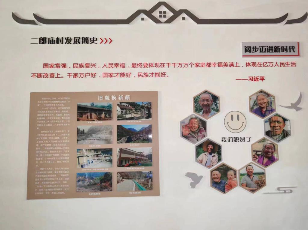 “苦难岁月永难忘,撸起袖子加油干,阔步迈进新时代。”是二郎庙村脱贫之路的缩影。清光绪三年,二郎庙村遭大旱;民国时期,二郎庙村经历横征暴敛,半数以上农民没有饭吃;解放以前,深受土匪烧杀抢掠。新中国成立之后,二郎庙村紧跟共产党的领导,建成武关河电站、开通道路。党的十八大以来,二郎庙村依托村情实际,完善发展规划,整合优势产业资源,聚力抓好脱贫攻坚、迈向小康路。如今,二郎庙村在新一轮的乡村振兴帮扶下,以秦岭山水乡村建设为抓手,加快打造精品乡村休闲游,昂首阔步向前进。