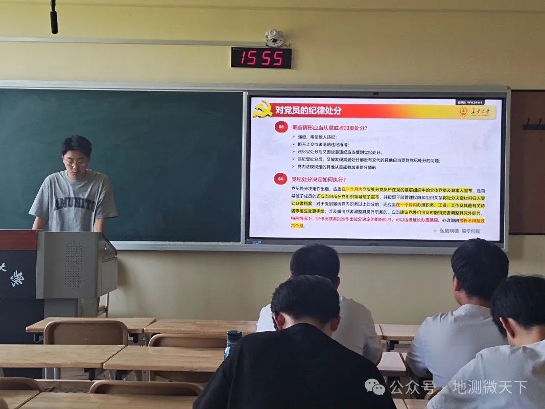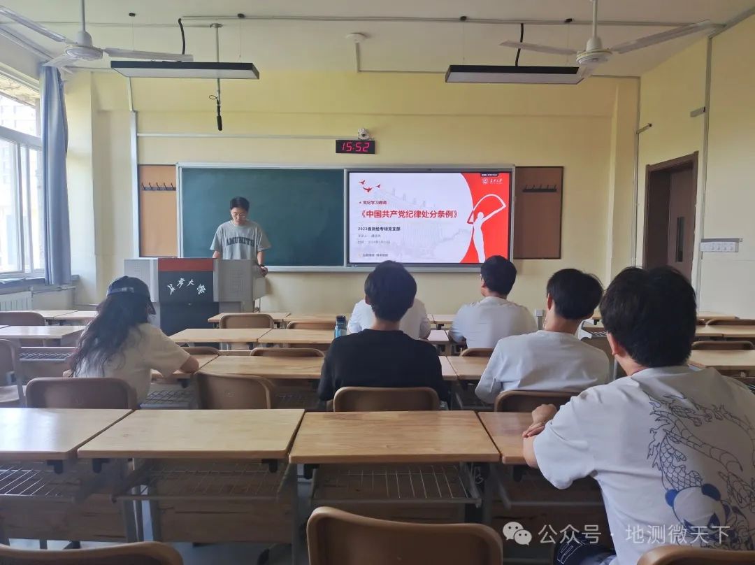 为深入学习《中国共产党纪律处分条例》,切实落实好习近平总书记在中国共产党第二十届中央纪律检查委员会第三次全体会议的重要讲话精神,2024年5月13日下午,2023级测绘专硕党支部于mjm世界杯官网楼406教室举行了《中国共产党纪律处分条例》党纪学习教育。学习会由龚浩冉同志主讲,全体支部党员参与。