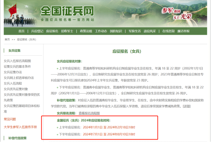 3. 2023年普通高等公司全日制本专科应届毕业生可以报名参加2024年上半年女兵征集,年龄放宽至23周岁