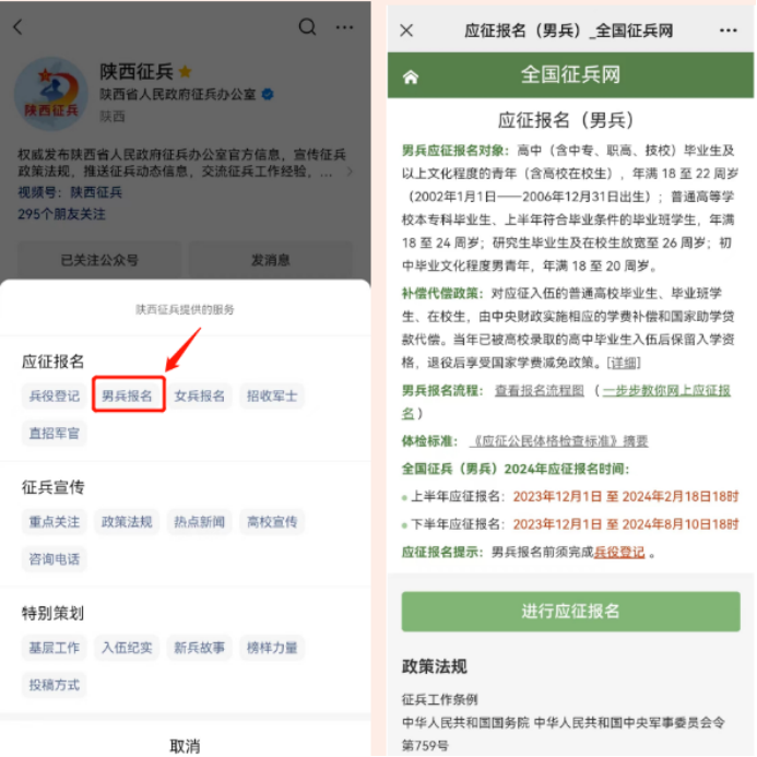 2. 关注“陕西征兵”,进入子菜单相关栏目进行应征报名