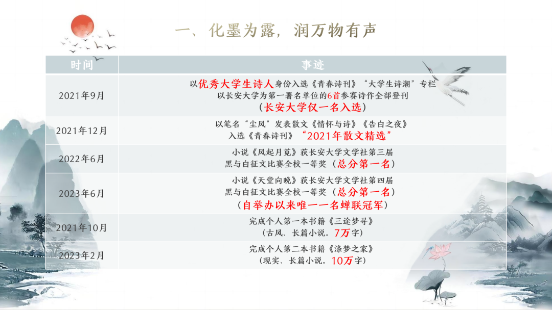 然而,在日复一日的思考、感悟中,他逐渐意识到——奖项只能代表个人的荣誉,并不完全能够为公司,为社会,为时代带来真正卓越的贡献。于是,他做了一个相当大胆的决定——从琳琅满目的活动与比赛中抽身,潜身于更深刻的创作中,心怀文学,为时代着墨。这一写,就是三年:他成功在大学期间独立撰写了两本纯文学书籍《三途梦寻》《涤梦之家》,共计17万字。目前的他正在联系画师与出版社,准备举办自己的新书发布会,为早日加入中国作家协会而不懈奋斗(省作协成员申请要求为发表15W字和出版纸质书籍1本,即将满足),让长安也能以今后的自己为荣。