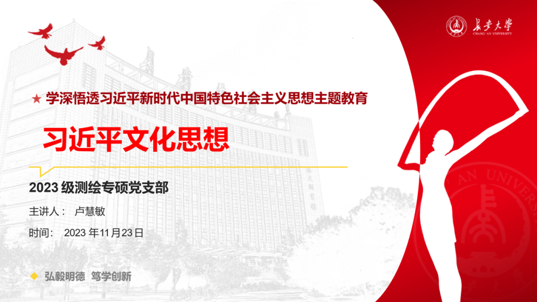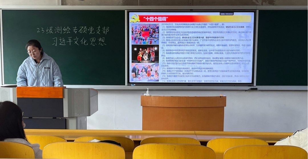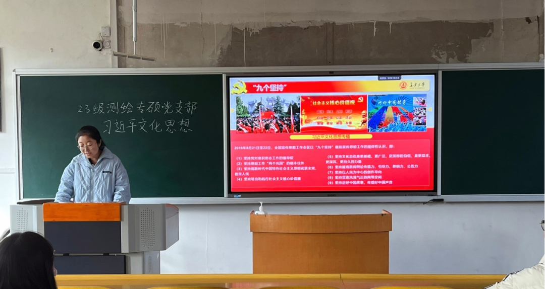 2023年10月7日至8日,全国宣传思想文化工作会议在北京召开。会议最重要的成果就是首次提出了习近平文化思想。习近平新时代中国特色社会主义思想的文化篇,在马克思主义中国化时代化进程中浓墨重彩、熠熠生辉。近日,2023级测绘专硕党支部以“习近平文化思想”为主题,进行针对性学习。此次主题学习由党支部书记卢慧敏同志进行讲解,全体党支部成员参与学习。