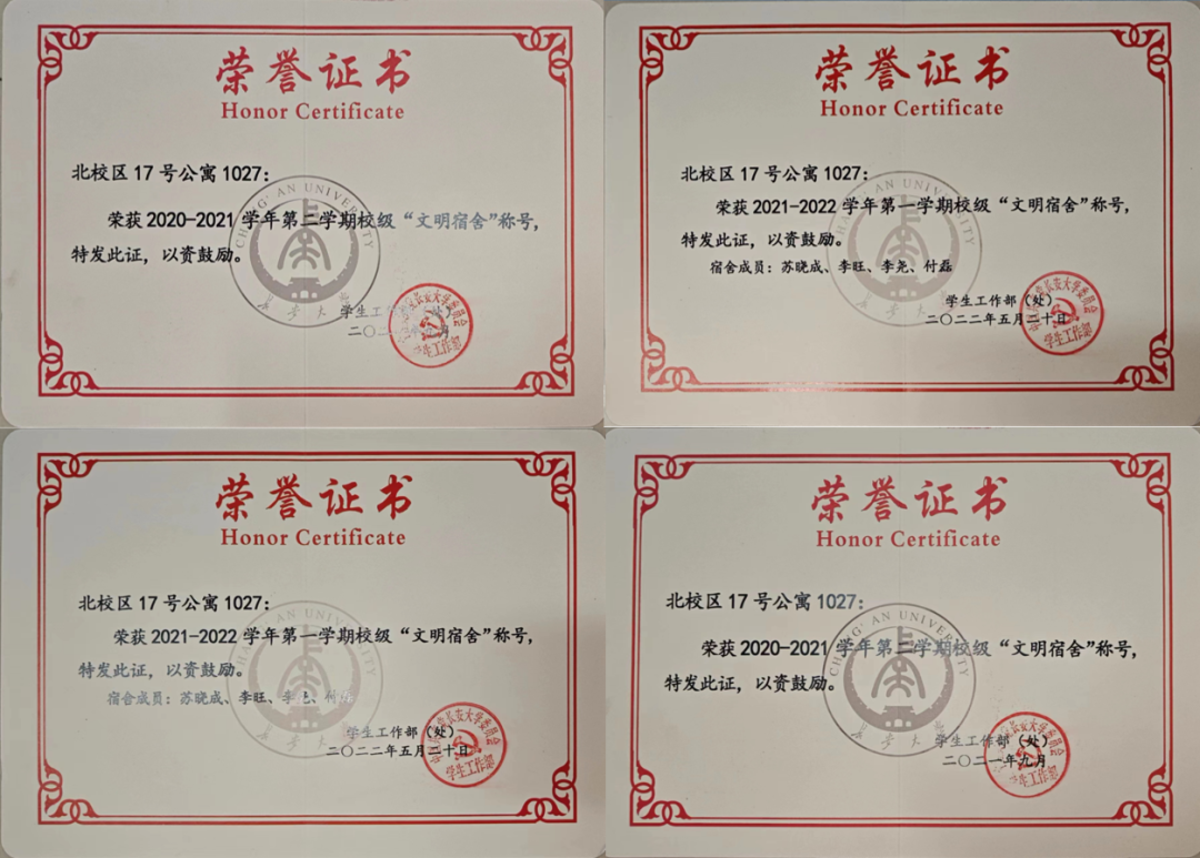 春生夏长,秋收冬藏。经过大学四年的沉淀,宿舍四人在个人素养和综合素质方面取得了优异的成果,宿舍三人获得专业推免资格,宿舍成员累计奖项及荣誉称号共100余项。宿舍所获奖学金累计4.5万余元,科创经费1万余元。