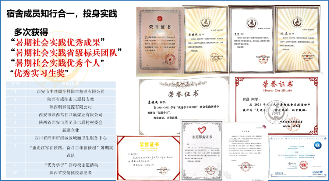宿舍成员一心向党,争做先锋,成为公司第一批“党员示范宿舍”,入党申请书提交率100%,连续三年获得校级文明宿舍。宿舍成员积极为同学服务有三人担任班级班长,一人担任班级综合委员,在各自的岗位上尽心尽责。在五四评优中获得“优秀共青团员”等荣誉称号。