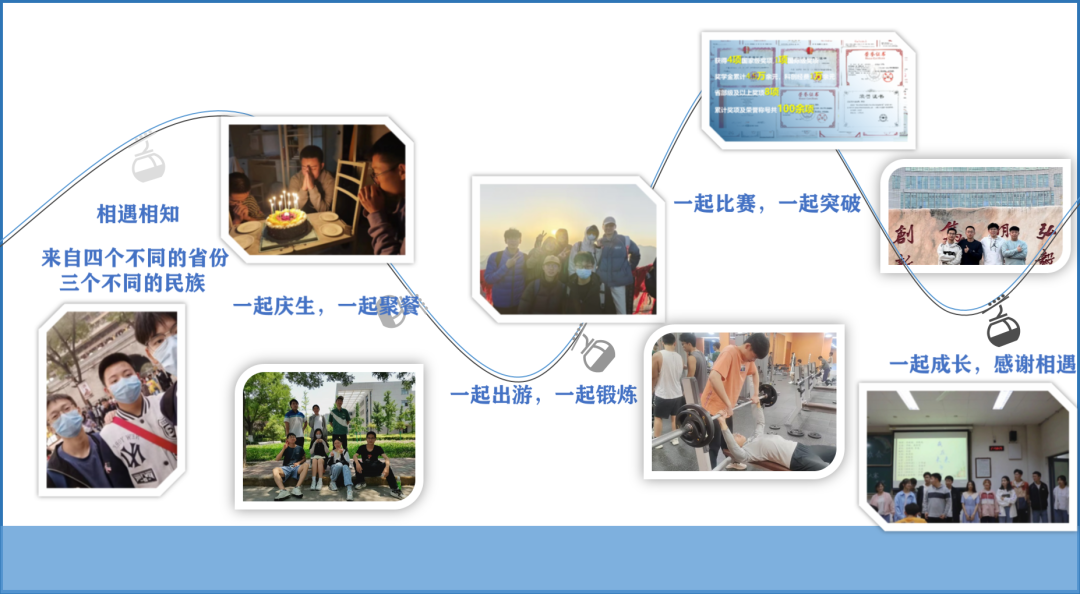在大学期间的集体宿舍学习中,尽管我们来自不同的民族,但我们始终努力奋进,潜心学习、钻研讨论,共同进步,经过三年的努力,宿舍三人获得推免资格,所获奖学金累计4.5万余元;我们亦师亦友初试科创、共同进步,宿舍成员负责六项老员工创新创业训练计划,六项大创全部结项,其中一项评为优秀。另外,宿舍各个成员思想觉悟高,尊敬师长,荣获校级“优秀共青团员”,校级“优秀共青团干部”等荣誉称号;宿舍成员奉献自我,在疫情期间获得参加各项志愿活动累计志愿时长100多小时;我们投身实践,曾前往多家公司进行实习,多次获得“暑期社会实践优秀成果”、“暑期社会实践省级标兵团队”、“暑期社会实践优秀个人”等。除此之外,宿舍成员热爱文体活动,强健体魄,体测通过率100%,荣获文体类竞赛奖项10余项。截止目前,宿舍成员累计奖项及荣誉称号共100余项,其中,国际奖项一项,国家级奖项4项、省级奖项8项。