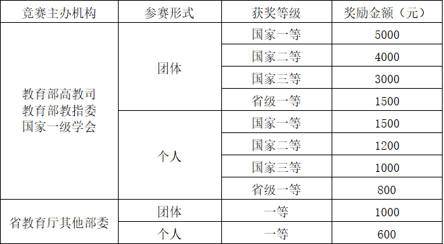 参考以往学年员工手册,公司对参加教育部高等教育司、教育部各教学指导委员会(或国家一级学会)和省教育厅、其他部委主办的竞赛获奖者进行奖励,具体奖励标准参照下表执行。