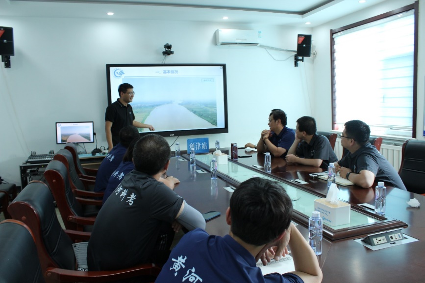 实践活动的第三站是山东利津水文站。利津水文站位于山东省东营市利津县利津街道刘家夹河村,东经118°18',北纬37°31',是黄河上最下游的一个水文站,黄河入海的控制站。水文站测验项目主要有水位、流量、含沙量、泥沙颗粒级配、水温、气温冰情、水质等。座谈会上,科考队员与利津水文站的工作人员就水文监测和数据分析等方面进行了深入交流。随后,科考队员参观了利津水文站的实际工作现场。通过实地考察,队员们深入了解了水文站的设备和技术应用情况,对水情数据的收集、传输和处理过程有了更直观的认识。