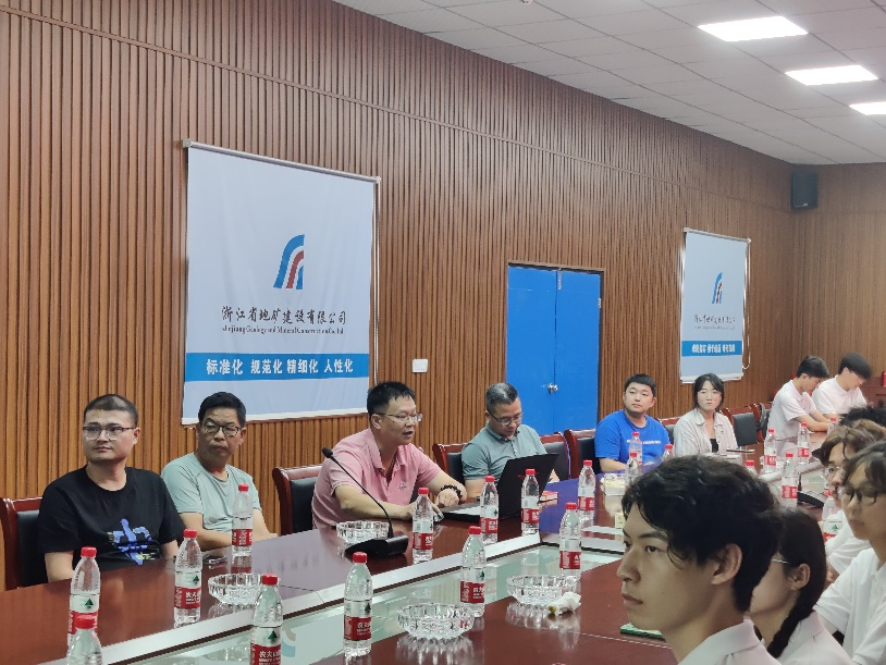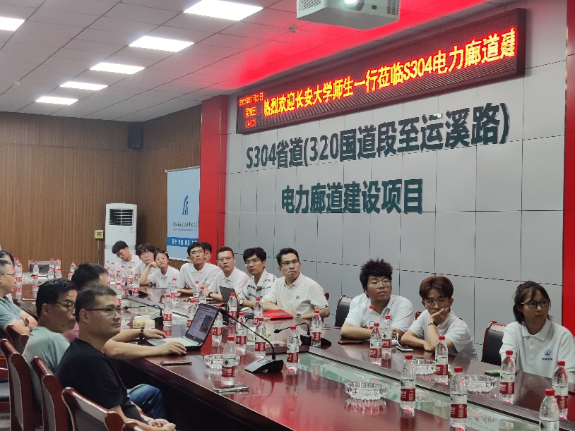 在公司工作人员的带领下,实践队员们来到S304电力廊道建设项目会议室,机械化工程公司副经理陈向、电力廊道建设项目经理石建坤、项目分管副经理边杭军、项目总工汪道威、资料员金冰莹、安全员魏佳彤、质量员刘涛列席会议。先由边杭军副经理向我们做了项目概况以及技术简介,边经理重点强调了项目施工过程中前期勘探工作的完整性,以及施工过程中安全保障的重要性。然后再由汪总工向我们具体讲解了本次项目所运用的技术,如顶管法和TRD法。