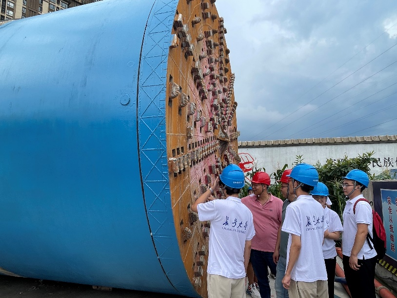 在项目介绍结束后,石经理、边副经理和汪总工带领实践队员来到施工现场,向同学们展示了顶管法所用的钻头,观摩了现场正在进行施工的顶管工作现场。