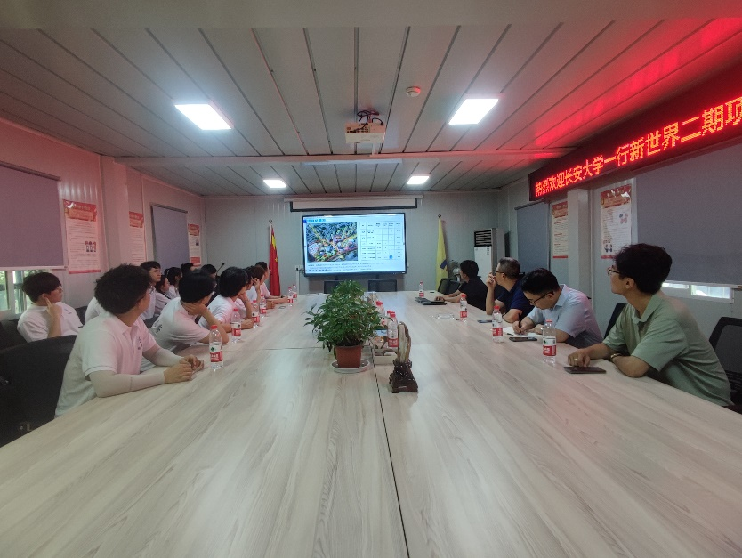 在公司工作人员带领下,实践队成员来到新世界望江新城项目会议室,机械化工程公司副经理陈向、特种工程公司经理翁奔哲、新世界望江项目总经理姚鑫林、项目部吕工程师列席会议,为我们做项目概况及技术介绍,在介绍了项目的基本信息后,为我们讲解本次项目用到的一些技术,提到了TRD法、RJP法、三轴搅拌桩等工程常用的技术,以及其他方面的施工方法,给实践队成员很大收获,了解了目前业界常用的技术方法,对加深其专业认知起到了很大作用。