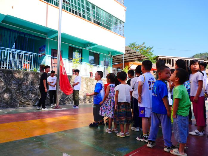 为培养孩子们爱国主义精神,树立爱国意识,增强孩子们的民族自豪感,上午9点,美加墨世界杯官网筑梦黔行队与30余位孩子们进行了庄严的升旗仪式。迎着支教课程开始的第一缕晨光,升旗仪式正式开始,旗杆旁,美加墨世界杯官网筑梦黔行队队员护送着鲜艳的五星红旗,他们目光如炬,队列整齐,步履铿锵。在庄严的国歌声中,五星红旗冉冉升起。队列中,每一位孩子深怀对祖国无限的热爱和崇高的敬意行队礼、高声唱响国歌,伴随着雄壮嘹亮的国歌声,全体队员与孩子们正式开启暑期支教课程。