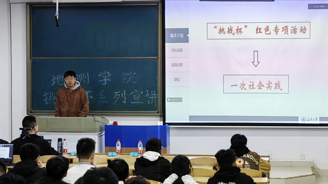 宣讲人曹昱杰通过国赛作品的基本介绍、目标成果、实践过程和建议四个方面来对同学们展开经验分享。他建议同学们可以通过文献调研、问卷调查、相关人物访谈等方法来充实作品。在调研时还可以通过走访当地融媒体、党校、文旅局及交通局等单位请求其援助、提供素材,可以节省大量时间和精力。除此之外,曹昱杰还特意强调红色专项团队要注重每个成员的参与度,视频内容要有深度而不是单纯的图片及视频拼接,要点是挖掘出调研地的红色力量、红色精神。