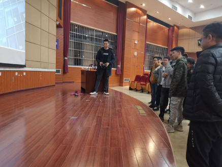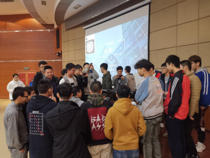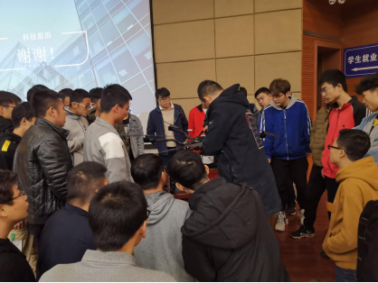 在交流提问环节,田总经理鼓励员工积极交流,对所有问题都进行了耐心的解答。在简单的交流后,公司技术专员向同学们展示了本次带来的新型仪器,由上海淀山勘测有限公司自主研发的大型无人机,并热情讲解此无人机的制作原理和工作优势,同学们热情高涨,认真听取讲解。