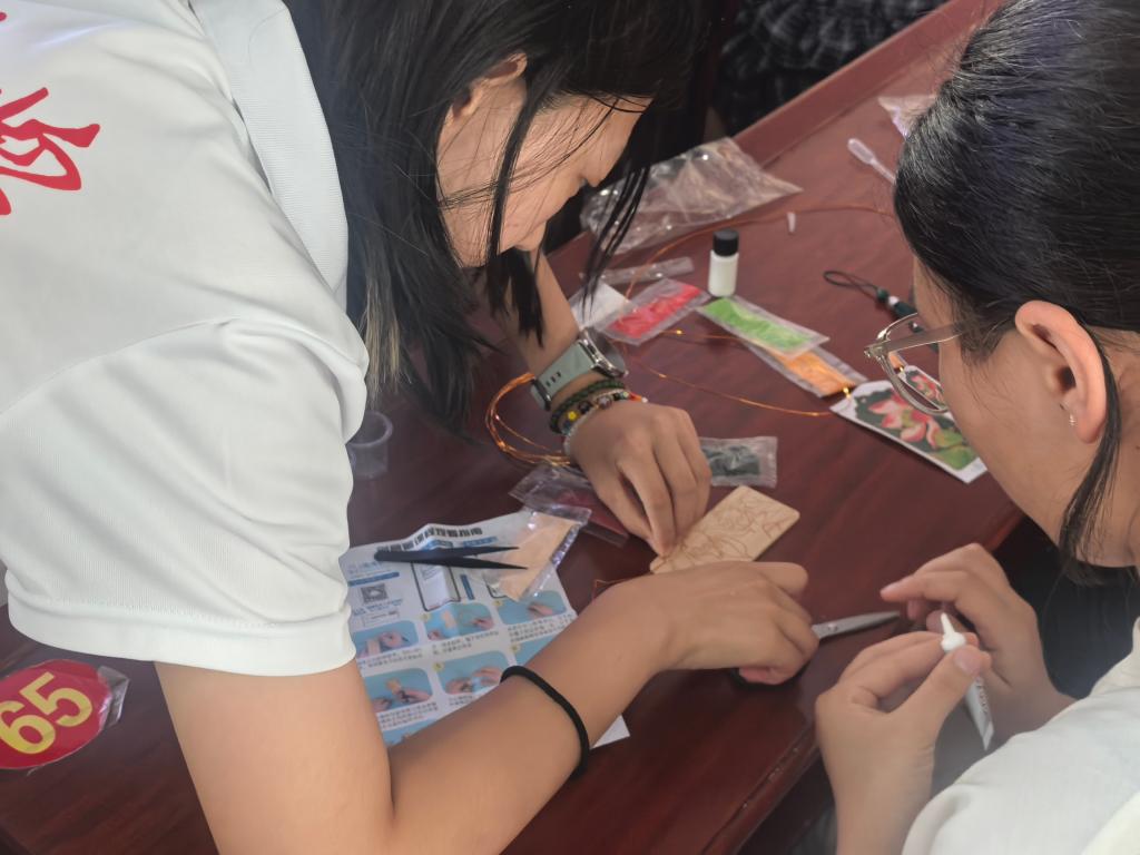 在制作教学环节,实践队队员于子涵详细讲解了掐丝与彩砂填充的关键技术要点:
