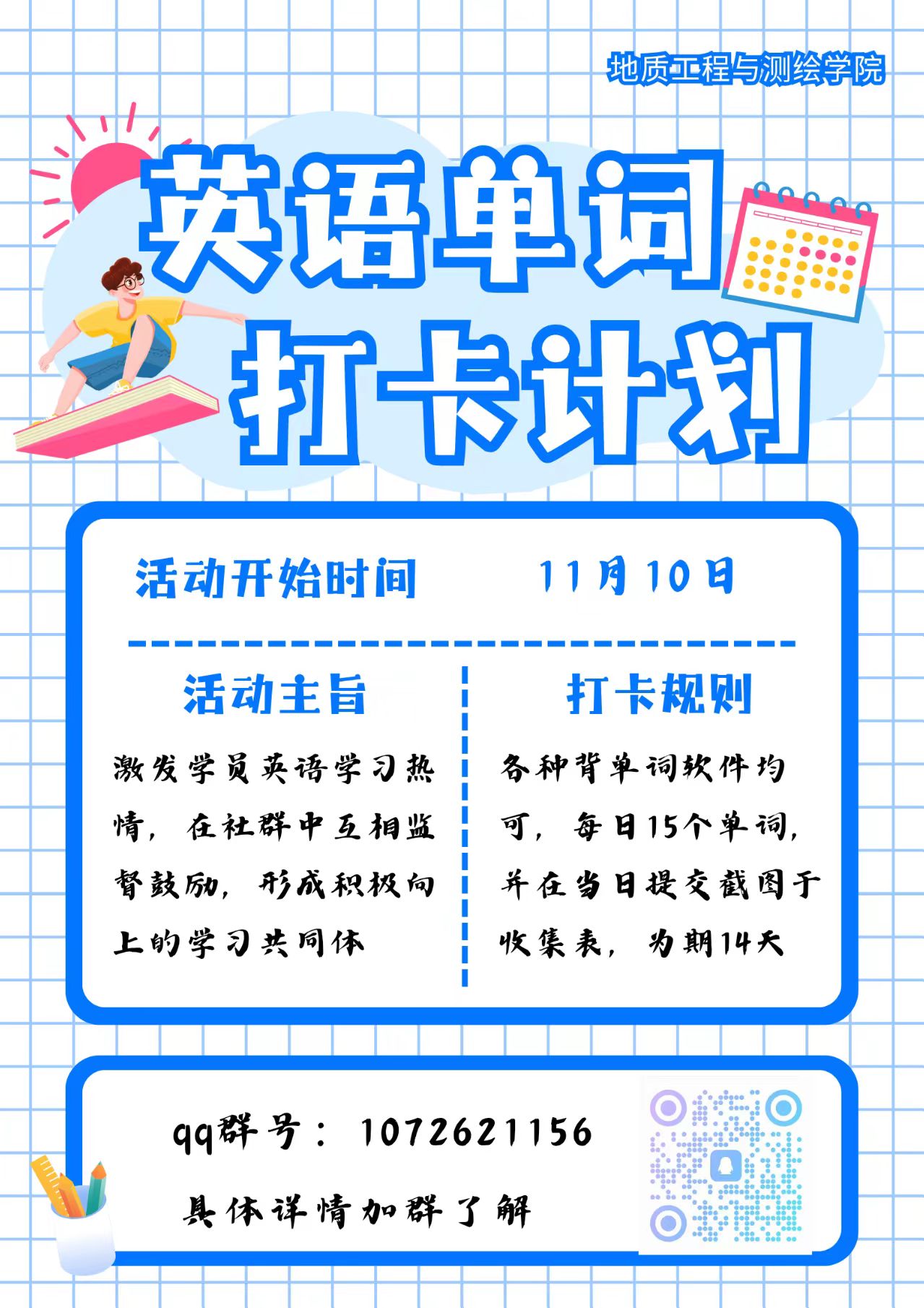扫描下方二维码或搜索QQ群号:1072621156;入群后完善信息,开启你的14天单词挑战之旅!mjm世界杯官网员工会期待同学们的积极参与,加入我们单词打卡的行列,备战四级,拥抱更好的自己,迎接光明的未来