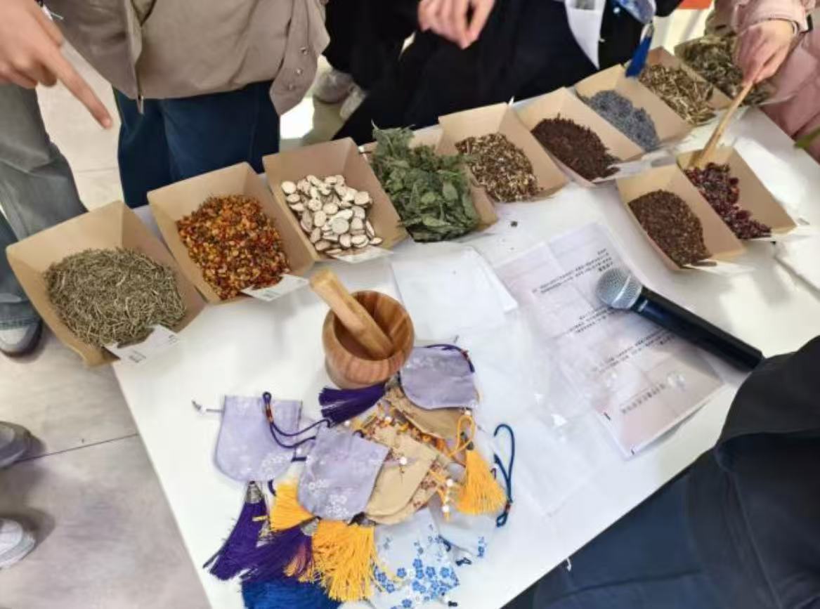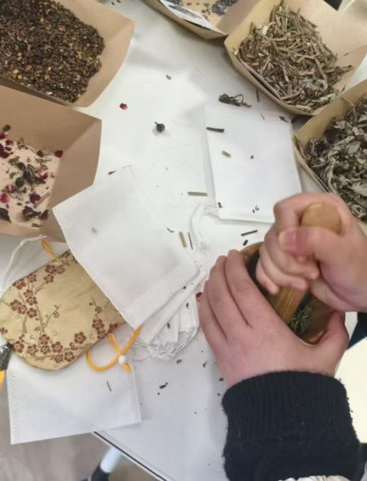 活动现场,同学们围坐在一起,在志愿者的引导下拿起分装在小碟里的天然香料——馥郁的玫瑰、温润的白芷、空灵的金合欢、爽利的薄荷……大家根据自己的喜好挑选、搭配,将这些带着自然气息的原料装进现场分发的素色香囊中。挑选香料时,鼻尖萦绕的草木芬芳慢慢抚平了心头的浮躁;装袋的过程里,不同香气的交织让大家的心情愈发松弛。