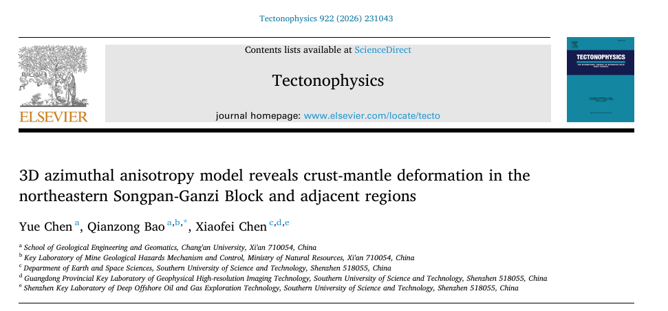 Chen, Y., Bao, Q., & Chen, X. (2026). 3D azimuthal anisotropy model reveals crust-mantle deformation in the northeastern Songpan-Ganzi Block and adjacent regions.Tectonophysics, 922, 231043.