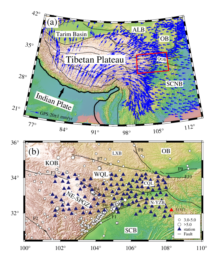 松潘-甘孜东北部及邻区位于青藏高原、华南板块与鄂尔多斯地块的构造交汇处(图1)。新生代以来,印度板块与欧亚板块的持续碰撞引发了青藏高原的隆升与扩展。作为高原东向扩展的前缘地带,松潘-甘孜东北部的岩石圈变形机制一直备受关注。