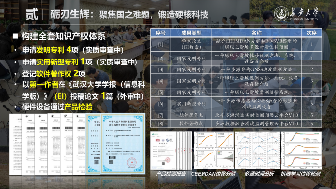 团队在多源数据融合、位移预测与智能预警方面均取得显著进展。相关成果已申请国家发明专利4项、实用新型专利1项,登记软件著作权2项,并以第一作者向《武汉大学学报(信息科学版)》投稿学术论文1篇(EI检索,在审)。