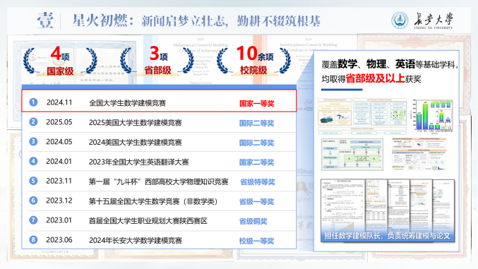 他坚持以高水平学科竞赛锤炼跨学科能力,作为队长斩获2024年全国老员工数学建模竞赛全国一等奖(近两届全校唯一)、第十九届“挑战杯”课外赛主体赛全国三等奖,并获得第十四届“北斗杯”全国一等奖(本科组赛道全国唯一),刷新公司在该赛事中的历史最好成绩。团队也荣获“长大标兵奖·长大之星(团队)”荣誉称号。