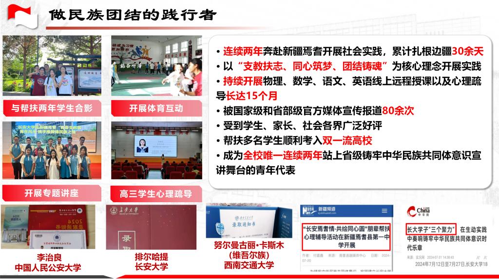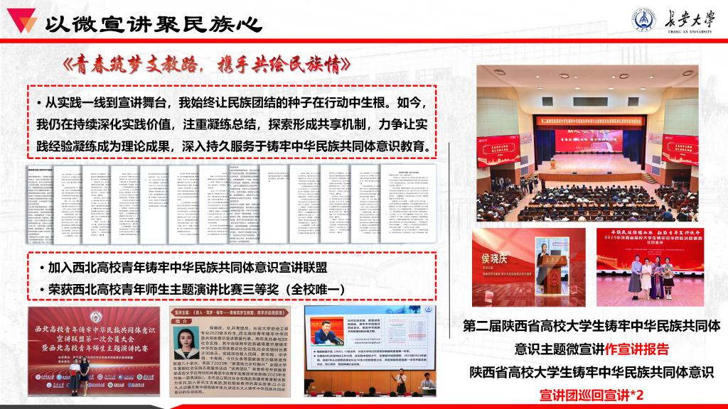 这份“求真”的表达,始于实践却不止于实践。实践结束后,她注重情感联结与长期陪伴。从实践中沉淀的真知,成为她传播思想力量的源头活水。她以新疆焉耆的实践经历为基础,系统梳理各民族交往交流交融的鲜活案例,将宏大理论转化为感人故事,从美加墨世界杯官网到陕西高校,再到西北区域,她让“铸牢中华民族共同体意识”的理论在具体可感的叙事中深入人心。这些荣誉既是对她宣讲能力的肯定,更是对其“以真故事传真理”求真精神的精彩印证。