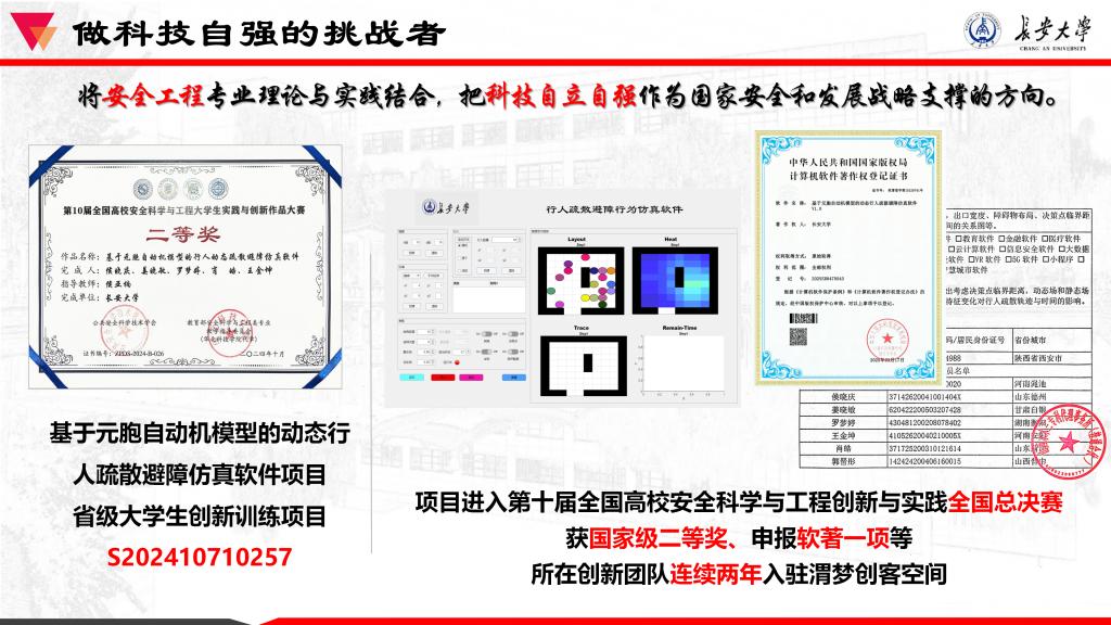 科创方面,她始终将科技创新与国家战略需求紧密结合。在3学年的学习中,作为负责人主持中央高校子计划研究课题1项,参加3项;主持校级老员工创新创业项目1项;主持省级老员工创新创业项目1项,参加2项;三人行老员工创新创业训练营资助1项;此外,她积极参加学科专业竞赛和各类活动,曾作为第三负责人获第九届安全科学与工程老员工创新实践与作品大赛国家级三等奖,作为负责人获第十届安全科学与工程老员工创新实践与作品大赛国家级二等奖,作为负责人获全国三维数字化设计与制造大赛省级一等奖,完成论文两篇。