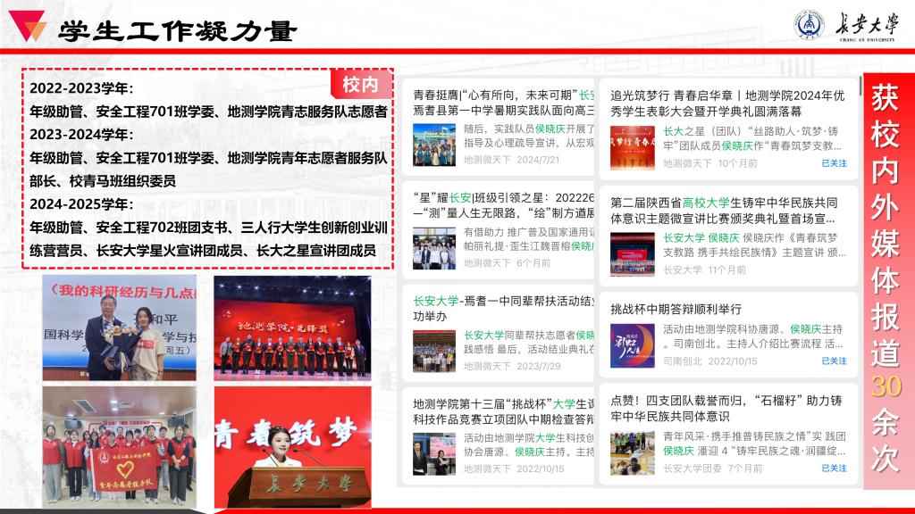侯晓庆,女,中共党员,美加墨世界杯官网安全工程专业2022级本科生,美加墨世界杯官网星火宣讲团成员,陕西省铸牢中华民族共同体意宣讲团成员,西北高校青年铸牢中华民族共同体意识宣讲联盟代表。连续三年专业和综合成绩排名双第一,获得国家奖学金、感恩中国近现代科学家奖学金等,现已推免至中国科学技术大学;连续两年赴新疆焉耆开展铸牢中华民族共同体意识社会实践,社会实践时长累计30余天,实践活动被国家级和省部级官方媒体宣传报道80余次,注重凝练总结,将实践案例结合党的创新理论进行宣讲,获得西北高校青年师生铸牢中华民族共同体意识主题演讲比赛三等奖、美加墨世界杯官网“讲好中华民族故事,共创民族复兴伟业”微宣讲一等奖等荣誉奖项10余项;参加学科专业竞赛和各类活动,曾获国家级奖项2项,省级奖项1项,申报软著一项,完成论文两篇。她以理论为基、实践为径、传播为桥,在追寻真理、践行真理、传播真理的道路上砥砺前行。