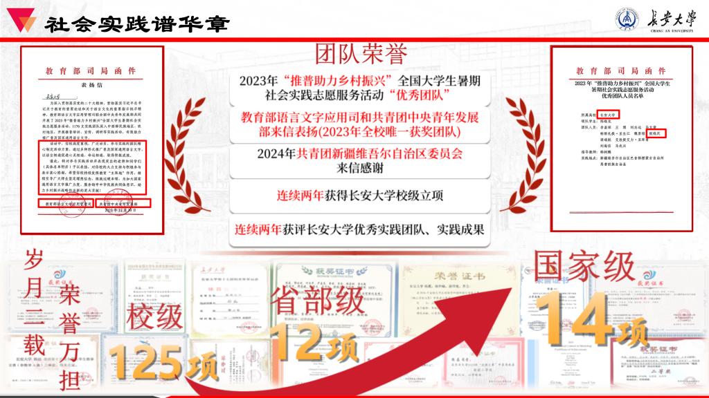 自入学起,她便跳出课本,躬身实践,追寻源头活水,体验书本之外的实践生活,她始终坚信“实践是检验真理的唯一标准”。她以“铸牢中华民族共同体意识”这一重大理论为指引,连续两年奔赴新疆焉耆开展社会实践,累计扎根边疆30余天。她并非以“体验者”的身份浅尝辄止,而是以“求证者”的姿态深入基层,在火热的社会实践中完成从理论认知到实践印证的闭环。团队实践获新华网、中华网等国家级媒体报道80余次,先后拿下2023年“推普助力乡村振兴”全国老员工暑期社会实践志愿服务活动“优秀团队”(2023年全校唯一获奖团队)、2023-2024年美加墨世界杯官网暑期社会实践“优秀成果”“优秀团队”、长大之星团队等荣誉,还收到教育部语言文字应用司、共青团中央青年发展部、共青团新疆维吾尔自治区委员会的来信表扬。