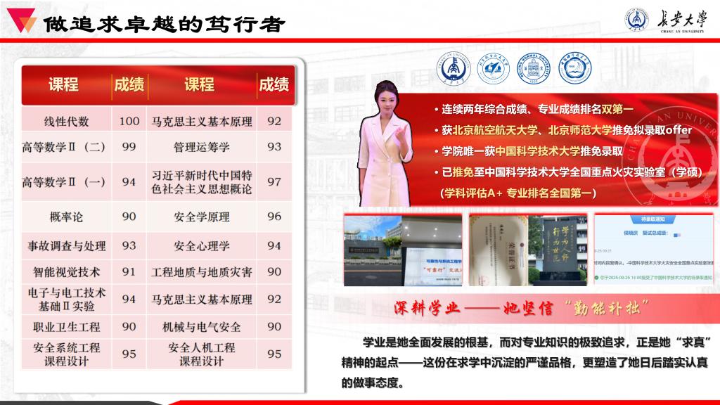 学业是她全面发展的根基,而对专业知识的极致追求,正是她“求真”精神的起点——这份在求学中沉淀的严谨品格,更塑造了她日后踏实认真的做事态度。一次性通过英语四六级,连续两年稳居专业榜首——大一综合测评2/59,大二文化课成绩领先第二名3.78分、综合成绩93.157(1/47),大三文化课91.18分、综合成绩95.2分(1/47);连续两年斩获国家奖学金,包揽校园贡献奖、学业优秀奖等多项荣誉。