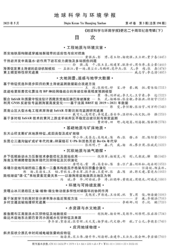 2023年,《地球科学与环境学报》迎来了更名二十周年!为了更好地促进《地球科学与环境学报》的发展,编辑部特邀请公司黄强兵教授、王利教授主持出版了《地球科学与环境学报》更名二十周年纪念专辑。本次专辑分上、下两册(2023年第2期和第3期)共出版了来自70家科研机构的45位赐稿专家撰写的高质量论文。其中,公司黄强兵教授发表了题为“西安地铁盾构隧道穿越地裂缝带的适应性与应对措施”的论文,王利教授发表了题为“基于特征优选和逐步回归的黄土滑坡监测数据融合改进方法”的论文,瞿伟教授发表了题为“改进哈里斯鹰优化算法与BP神经网络组合的滑坡位移高精度预测模型”的论文,朱武教授发表了题为“联合InSAR和质量守恒法估计西藏贡觉地区雄巴滑坡厚度”的论文,赵超英教授团队发表了题为“基于多时相InSAR技术的黄河上游龙羊峡库区不稳定边坡识别与形变监测”的论文。