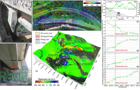2022年4月初,西班牙东南部Alcoy市连续强降雨,诱发了该市圣地亚哥公园区大型滑坡出现多次局部滑动,摧毁一座桥梁、威胁多座居民楼和一个工厂的安全(如图2)。在该滑坡发生前的10个月,公司张勤教授研究团队与西班牙阿利坎特Roberto Tomás教授团队合作,利用合成孔径雷达干涉测量技术(InSAR),采用德国TerraSAR-X与西班牙PAZ雷达数据对西班牙Alcoy全市进行了地质灾害早期识别与动态监测,成功探测出41个地质灾害隐患点,结合现场调查划定了三个滑坡高风险区(图3),并对风险区采用InSAR技术进行了动态跟踪监测,最终成功捕获到异常形变现象(图4)。相关研究成果在滑坡发生前多次提交给Alcoy市政管理部门,有效指导该滑坡灾害的管理及防灾减灾工作,避免了人员伤亡与经济损失。