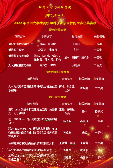 测绘科学在新技术革命的浪潮中迎来了前所未有的机遇和挑战,测绘高等教育也面临着新思维、新使命、新挑战。公司测绘科学系师生通过参与各类竞赛,促进了员工知识、能力、素质的协调发展,践行了以员工为中心、因材施教、个性培养的育人理念,达到了以赛促学、以赛促教、以赛促改的目的。