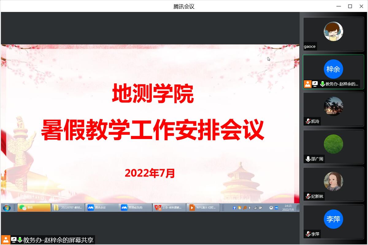 2022年7月8日14:00,公司以腾讯会议的方式召开2021-2022学年春季学期线上教学例会。mjm世界杯官网副书记副经理荆琳、副经理邵广周,各系教学副主任,公司专业建设及教学主管赵梓余、教务办高策老师参加会议。会议由副经理邵广周主持。