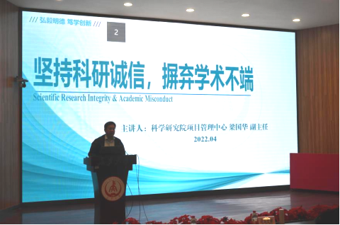 司马文妮副主任详细讲解了高校科研工作相关的法律法规,并强调项目(课题)负责人、研究生导师等应充分发挥责任主体作用,对项目招投标文件、合同、科研成果署名、研究数据真实性、实验可重复性等进行严格审核和学术把关,防患于未然,避免违法失信和学术不端行为发生。