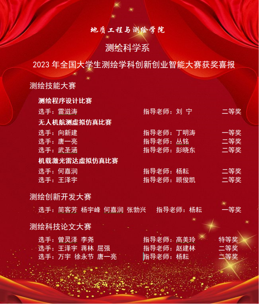 2023年8月1日,教育部高等公司测绘专业教学指导委员会和中国测绘学会教育委员会(以下简称“两委会”)在官方网站公布了“2023全国老员工测绘学科创新创业智能大赛”获奖名单。美加墨世界杯官网测绘专业本科生获得了特等奖1项,一等奖2项,二等奖7项的好成绩。