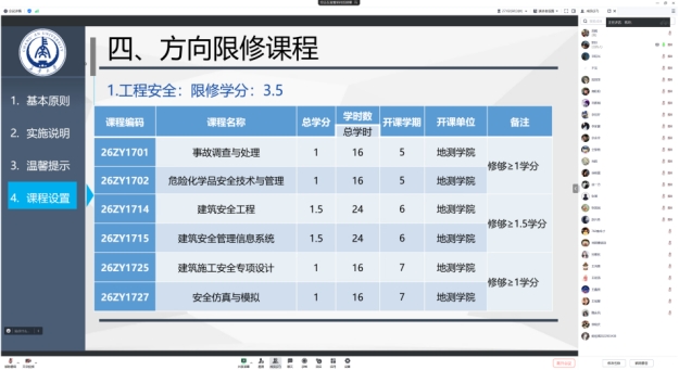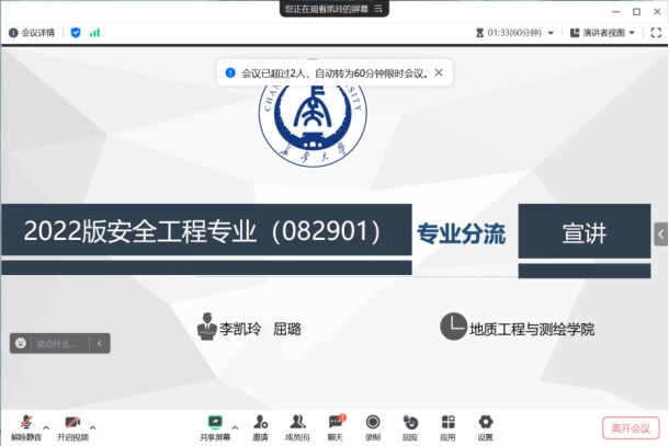 根据《美加墨世界杯官网本科生转专业及专业分流管理办法》及本学期教学工作计划,2024年度本科生专业分流工作全面开展。为体现“公开、公正、公平”的原则,保障员工权益,2024年4月28日,mjm世界杯官网安全工程系召开了2022级安全工程专业专业分流线上宣讲会。安全工程系副主任李凯玲、教师屈璐,以及安全工程系2022级本科生共计四十余人参加了会议。会议由李凯玲副教授主持。