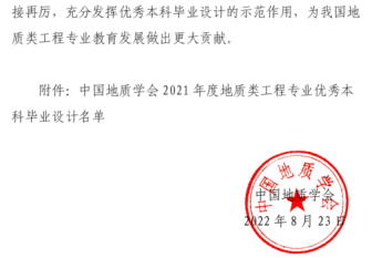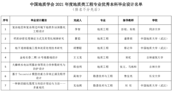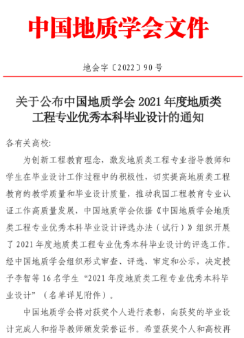 为创新工程教育理念,激发地质类工程专业指导教师和员工在毕业设计工作过程中的积极性,切实提高地质类工程教育的教学质量和毕业设计质量,推动我国工程教育专业认证工作高质量发展,中国地质学会面向全国地质类工程专业开展优秀本科毕业设计评选工作。本次中国地质学会共收到全国地质类各专业推荐的优秀本科毕业设计候选材料共计85份。根据《中国地质学会地质类工程专业优秀本科毕业设计评选办法(试行)》,经形式审查、初评、终评等环节,共评选出16份优秀本科毕业设计。