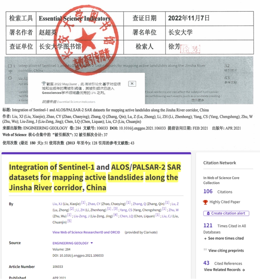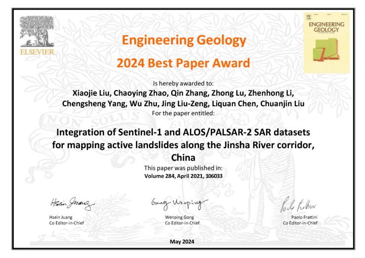 2024年5月10日,地学领域权威学术期刊《Engineering Geology》揭晓了2024年度最佳学术论文奖。公司赵超英教授团队的研究成果《Integration of Sentinel-1 and ALOS/PALSAR-2 SAR datasets for mapping active landslides along the Jinsha River corridor, China》榜上有名。该奖项是从2021年至2023年间发表的所有论文中评选而出,经过论文总被引次数初选,主编和编辑团队审议而产生,最终仅有六篇论文入选。