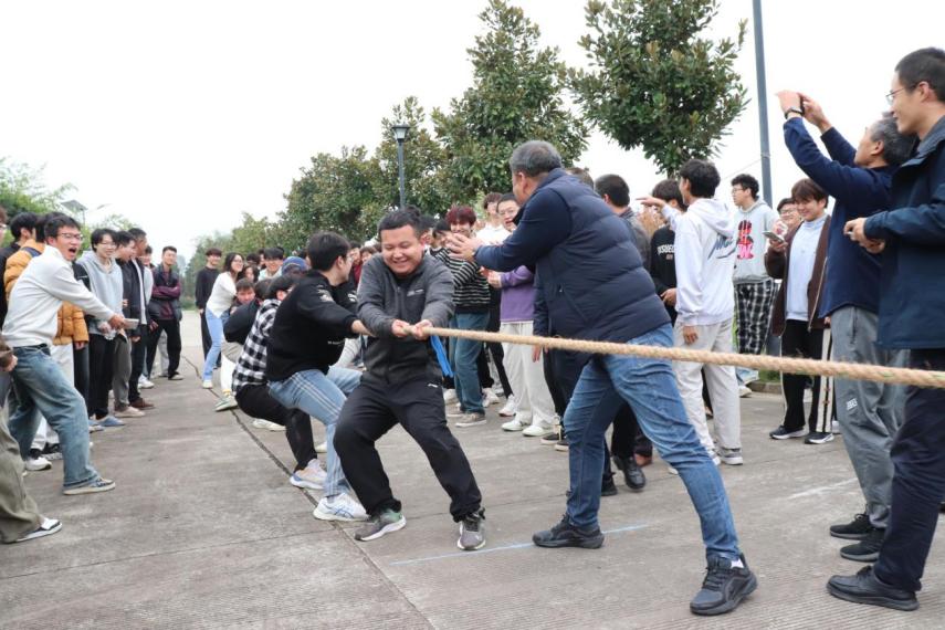 随后,实习基地组织了师生拔河比赛,员工们以班级为单位,组成8支队伍同台竞技,现场气氛热烈,队员们紧握长绳,身体后倾、脚步稳扎,展现出饱满的斗志与协作精神。生态地质 104 班凭借默契的配合与顽强的毅力,在多轮较量中一路过关斩将,最终成功斩获拔河比赛冠军。比赛尾声,公司领导与老师们与生态地质104班的队伍进行比赛,与同学们一同拉起长绳。师生同心协力的身影成为实习基地最温暖的风景,不仅延续了比赛的欢乐氛围,更拉近了师生间的距离,让团队协作的精神在互动