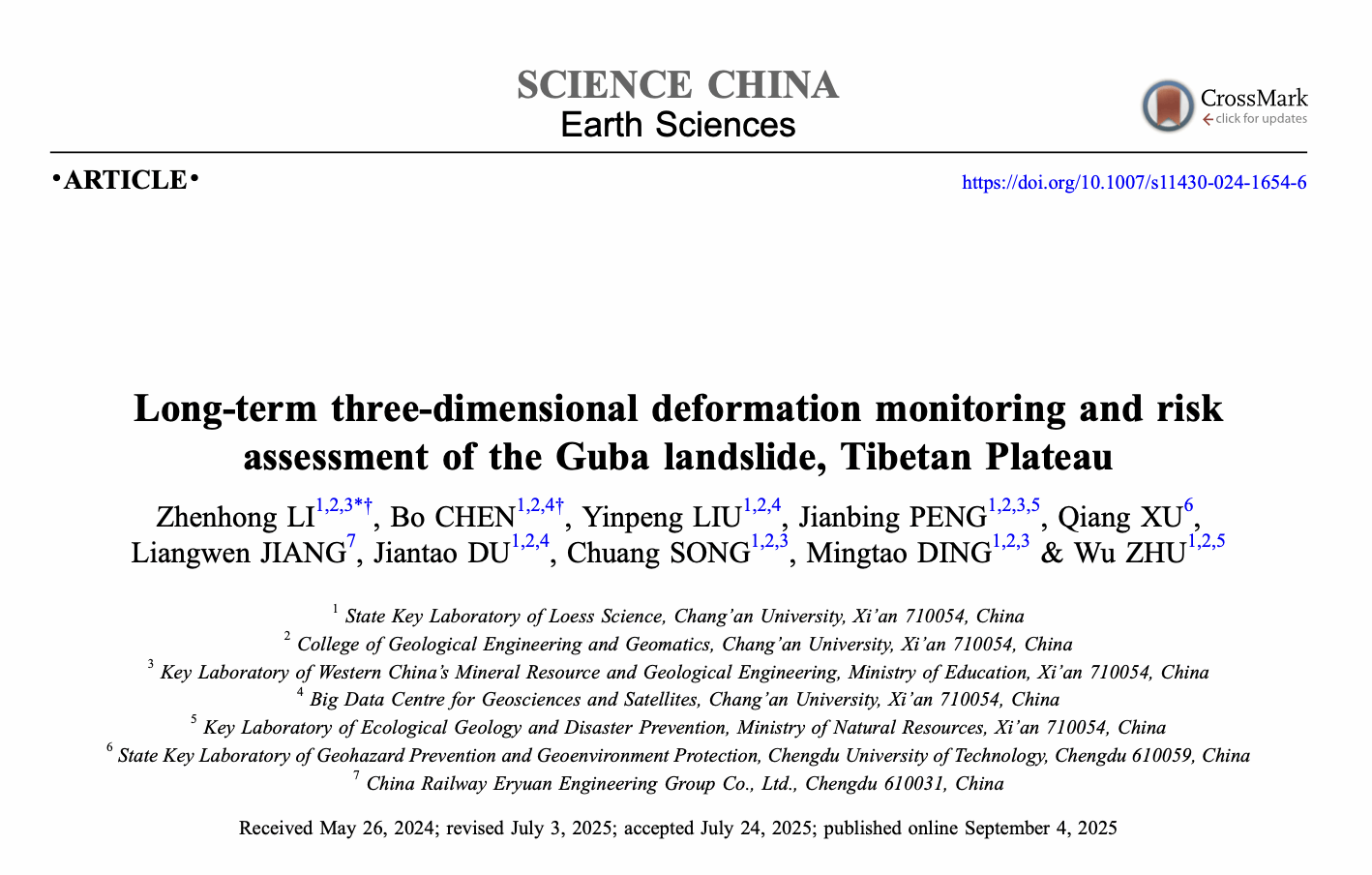 在国家自然科学基金重大项目(批准号:41941019)的资助下,美加墨世界杯官网李振洪教授团队与成都理工大学许强教授、中铁二院蒋良文副总工程师合作,在人迹罕至高位远程滑坡长时序三维监测和风险评估方面取得新进展。相关研究成果以“青藏高原古巴滑坡长时序三维形变监测和风险评估”为题,于2025年9月3日发表于《中国科学:地球科学》(Science China Earth Sciences)杂志,通讯作者为美加墨世界杯官网李振洪教授,共同第一作者为陈博博士。文章链接:https://doi.org/10.1007/s11430-024-1654-6.