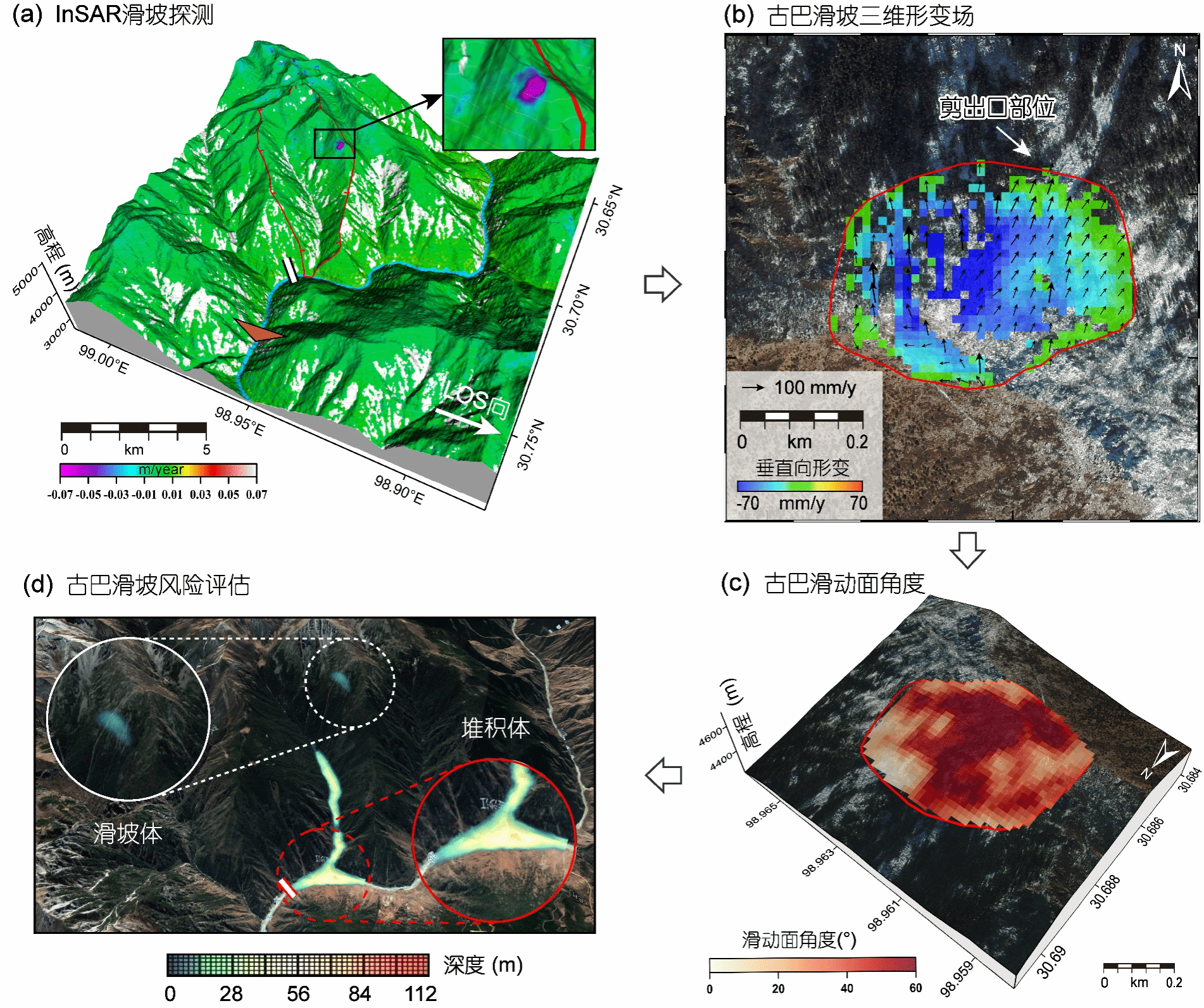 高位远程滑坡是高山峡谷区最具破坏力的地质灾害类型之一,往往具有隐蔽性强、规模大、运动距离远等特点,常规手段难以实现早期识别和监测。研究团队利用2007–2023年间多平台合成孔径雷达卫星观测影像,采用干涉合成孔径雷达(InSAR)时间序列技术,首次在青藏高原交通廊道金沙江大桥附近发现一处正在活动的大型岩质滑坡——古巴滑坡。该滑坡平面面积约0.17km²,体积约840万立方米,距正在建设的金沙江大桥和叶巴滩水电站直线距离分别约4km和7km,严重威胁国家重大工程施工建设及未来安全运营。
