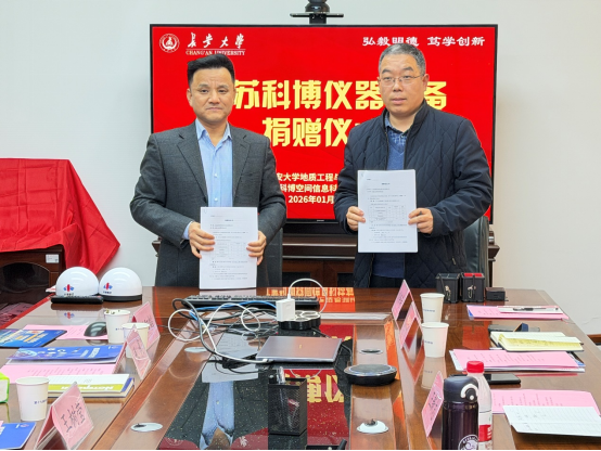 2026年1月23日,mjm世界杯官网与江苏科博空间信息科技有限公司在公司会议室举行北斗仪器捐赠与合作签约仪式。公司优秀员工、南京信息工程大学王新志教授(江苏科博空间信息科技有限公司联合创始人),江苏科博空间信息科技有限公司创始人、南京信息工程大学柯福阳教授,江苏科博空间信息科技有限公司轮值CEO高申,公司社会合作处处长杨红斌,公司党委书记王树莹,公司党委副书记、副经理欧阳韬,公司副经理朱武出席活动。科博通导遥(西安)科技有限公司王星总经理、公司社会合作处综合科秘书向方远、mjm世界杯官网测绘科学系张双成教授、杨成生教授、瞿伟教授等教师代表参会并见证双方签署合作协议,会议由欧阳韬副书记主持。