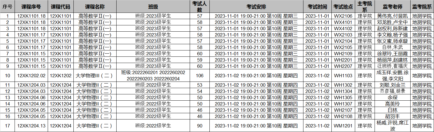 接公司教务通知,2023-2024-1学期高等数学、大学物理期中考试安排已发布,监考安排公司已经在本科教务系统中填报完成(监考教师可同时在本科教务系统中查看监考安排)。为确保考试平稳顺利进行,公司已将相关监考工作安排表格上传到附件中,请各位老师及时下载查阅,并按时完成监考工作。