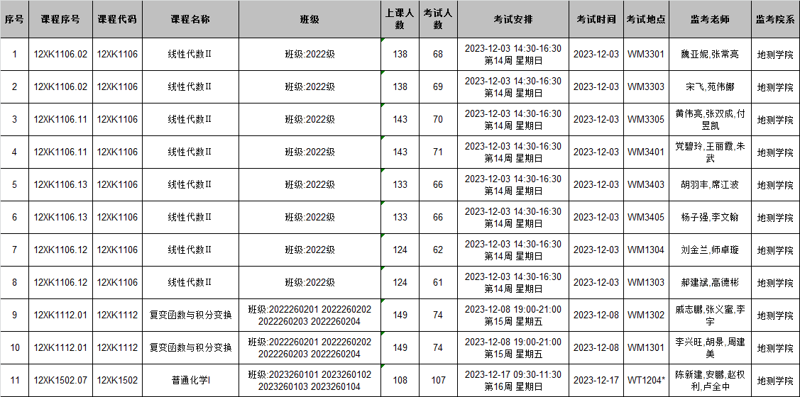 本学期线性代数、复变函数、普通化学I期末考试监考安排已发布,监考安排公司已经在本科教务系统中填报完成(监考教师可同时在本科教务系统中查看监考安排)。为确保考试平稳顺利进行,公司已将相关监考工作安排表格上传到附件中,请各位老师及时下载查阅,并按时完成监考工作。