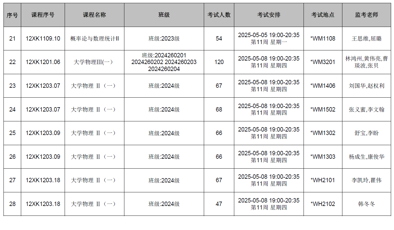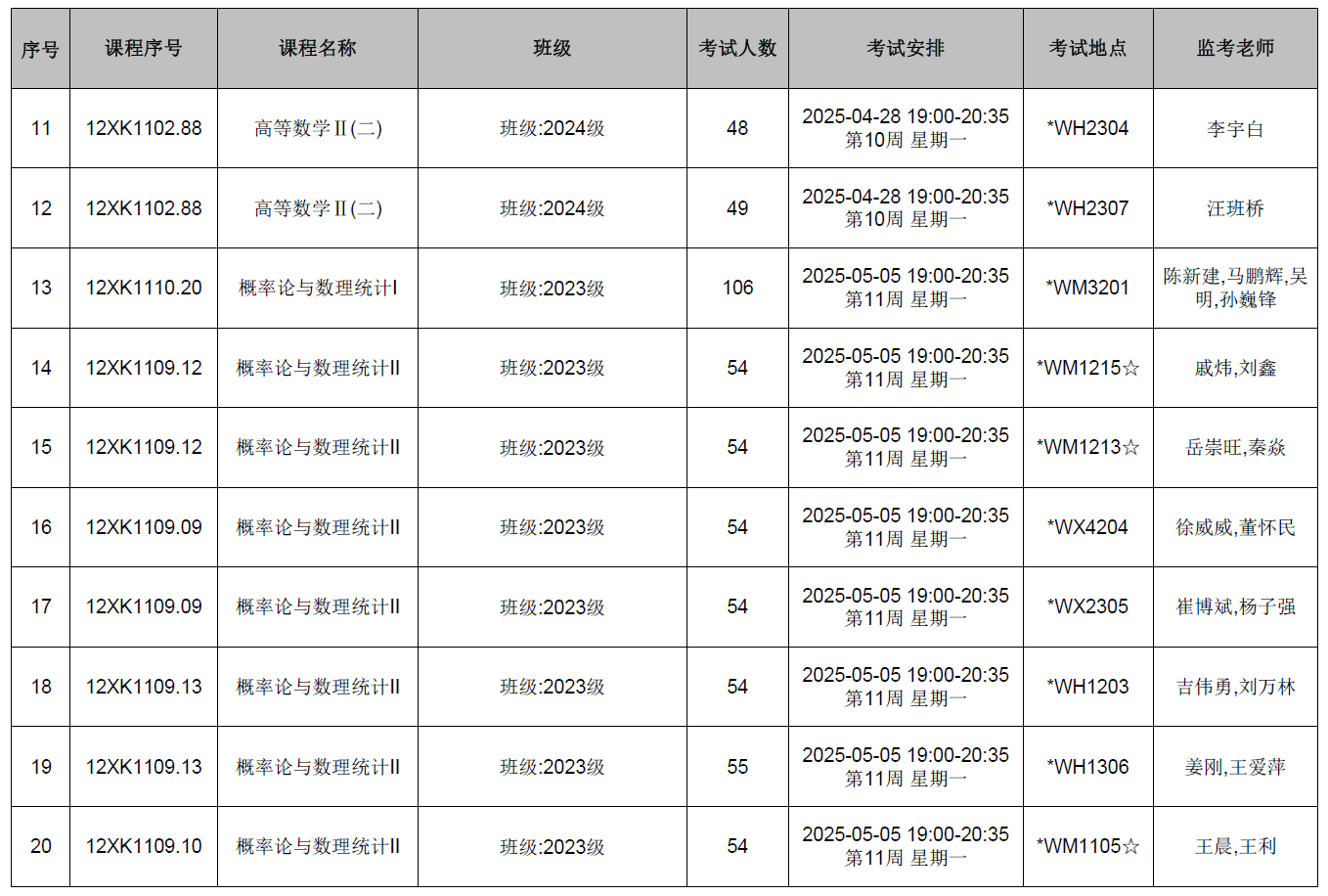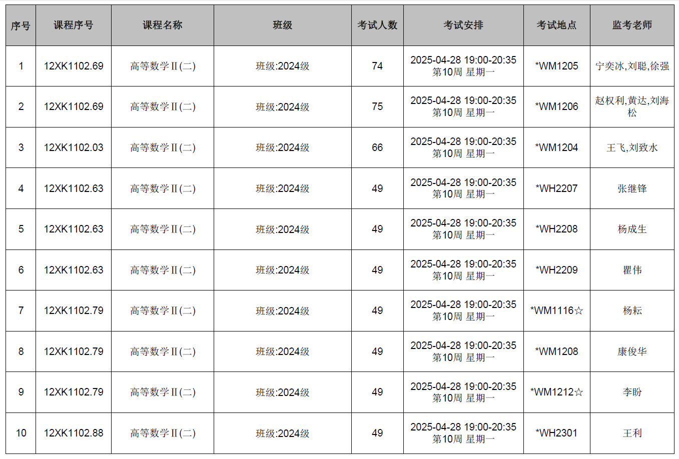 2024-2025-2学期高等数学、概率论与数理统计、大学物理期中考试安排已发布,监考安排公司已经在本科教务系统中填报完成(监考教师可同时在本科教务系统中查看监考安排)。为确保考试平稳顺利进行,公司已将相关监考工作安排表上传到附件中,请各位老师及时下载查阅,并按时完成监考工作。